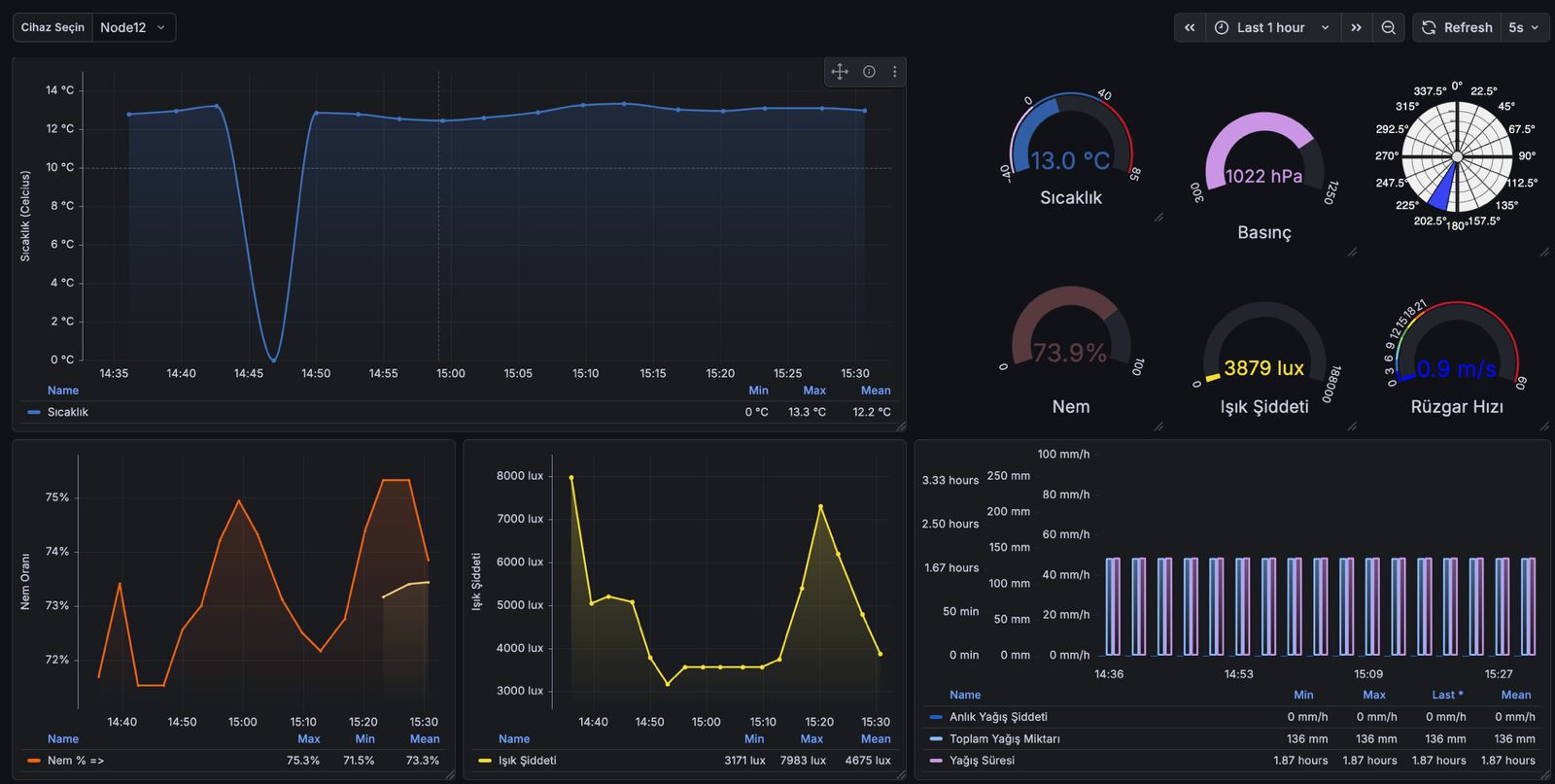 Kampüs genelinden toplanan meteoroloji verileri, aşağıdaki gibi merkezi bir gösterge panelinde (dashboard) gerçek zamanlı olarak izlenebilmekte ve raporlanabilmektedir. Sensörlerden gelen veriler CBS platformlarına entegre edilerek anlamlı görsel çıktılara dönüştürülmektedir.